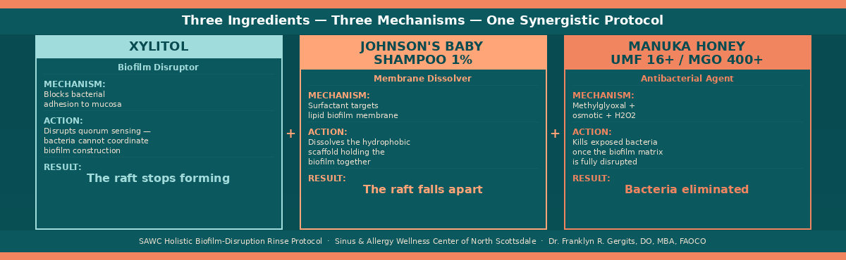 The three-ingredient holistic rinse protocol I recommend for patients with RARS or early CRS who are caught in the antibiotic cycle works through three simultaneous and synergistic mechanisms. The goal is not to simply wash the bacteria away — though that is part of it. The goal is to destroy the raft before the sharks even arrive.