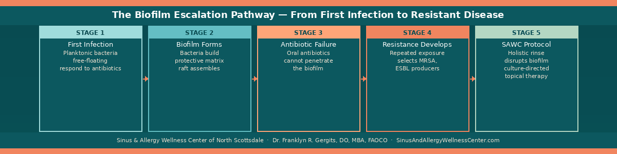 There is a pattern I see constantly in my North Scottsdale rhinology practice. A patient arrives with their fourth or fifth sinus infection of the year. They have been to urgent care twice. Their primary care physician has prescribed three courses of oral antibiotics. They feel better for two or three weeks after each course — and then the infection is back. Nobody has explained to them why this keeps happening. Nobody has tested what is actually living in their sinuses. And nobody has discussed with them whether the treatment they keep receiving is even capable of reaching the bacteria that are driving their symptoms.