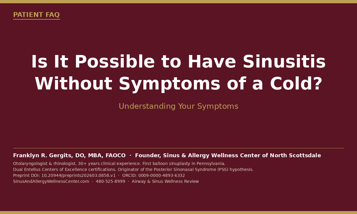 Dr. Franklyn R. Gergits, DO, MBA, FAOCO is an otolaryngologist and rhinologist with over 30 years of clinical experience treating sinus and airway disease. He is the founder of the Sinus & Allergy Wellness Center of North Scottsdale and performed the first balloon sinuplasty in Pennsylvania. He holds dual Entellus Centers of Excellence certifications and specializes in office-based nasal and sinus procedures under local anesthesia. Dr. Gergits is the originator of the Posterior Sinonasal Syndrome (PSS) hypothesis — a clinical framework identifying posterior nasal mucosal inflammation driven by pepsin and laryngopharyngeal reflux as an etiological precursor to chronic rhinosinusitis. His hypothesis manuscript is currently under peer review, with a preprint available at Preprints.org (DOI: https://doi.org/10.20944/preprints202603.0858.v1). ORCID: 0009-0000-4893-6332.