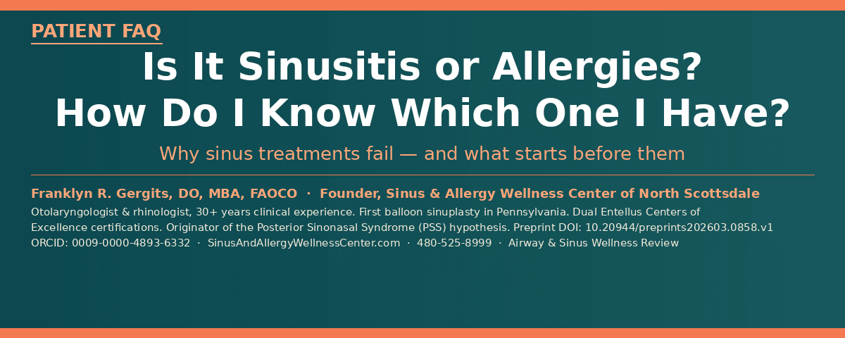 Franklyn R. Gergits, DO, MBA, FAOCO is an otolaryngologist and rhinologist with over 30 years of clinical experience. He is the founder of the Sinus & Allergy Wellness Center of North Scottsdale, where he performs in-office balloon sinuplasty, turbinate reduction, NEUROMARK®, and swell body reduction procedures under local anesthesia. He performed the first balloon sinuplasty in Pennsylvania, holds dual Entellus Centers of Excellence certifications, and is the originator of the Posterior Sinonasal Syndrome (PSS) hypothesis, with a preprint available at Preprints.org (DOI: 10.20944/preprints202603.0858.v1). ORCID: 0009-0000-4893-6332.