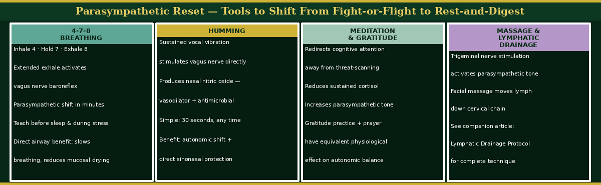 Humming is underutilized in clinical airway medicine. Sustained humming produces vagal stimulation and sinonasal nitric oxide simultaneously — a parasympathetic shift combined with a direct antimicrobial and vasodilatory effect in the very tissue we are trying to protect. It costs nothing and takes thirty seconds.