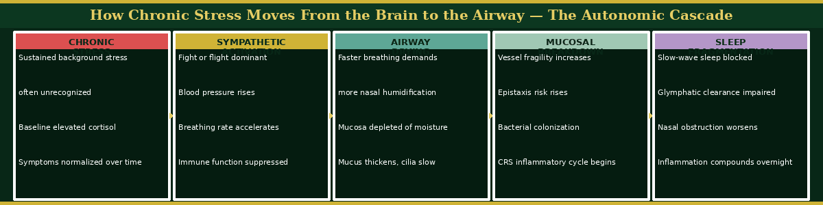 What makes this particularly insidious is that many patients are not aware of how chronically stressed they are. The body adapts. The elevated baseline becomes normal. And the airway inflammation that results is attributed to allergy, or infection, or bad luck — not to the sustained sympathetic activation that has been degrading the mucosal defense system for months or years.