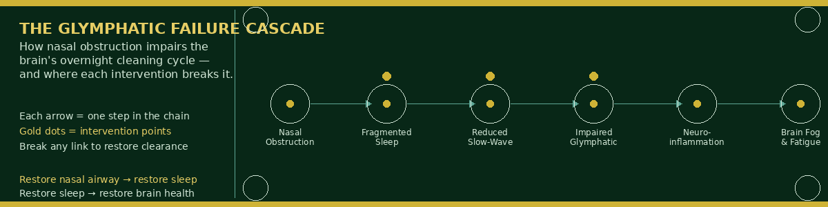 The diagram below maps the cascade from nasal obstruction through fragmented sleep to glymphatic failure and neuroinflammatory accumulation — showing exactly where each intervention in the protocol interrupts the cycle.