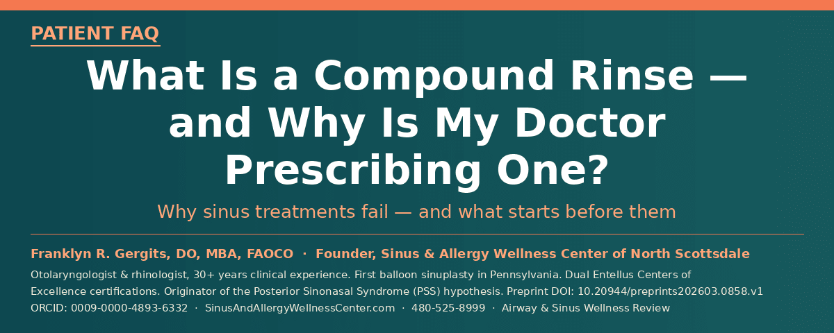Franklyn R. Gergits, DO, MBA, FAOCO is an otolaryngologist and rhinologist with over 30 years of clinical experience. He is the founder of the Sinus & Allergy Wellness Center of North Scottsdale, where he performs in-office balloon sinuplasty, turbinate reduction, NEUROMARK®, and swell body reduction procedures under local anesthesia. He performed the first balloon sinuplasty in Pennsylvania, holds dual Entellus Centers of Excellence certifications, and is the originator of the Posterior Sinonasal Syndrome (PSS) hypothesis, with a preprint available at Preprints.org (DOI: 10.20944/preprints202603.0858.v1). ORCID: 0009-0000-4893-6332.