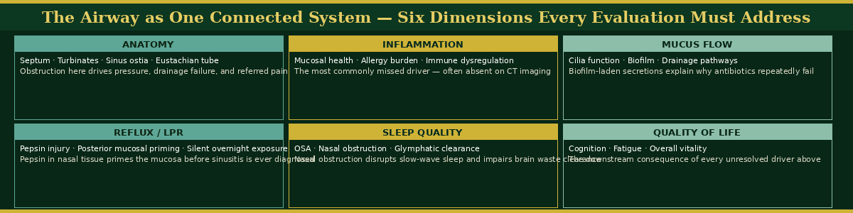 “The framework below maps the six dimensions of airway evaluation that inform every clinical encounter at SAWC — and the clinical significance of each. Disruption in any one of these areas can drive symptoms that appear to originate somewhere else entirely.”