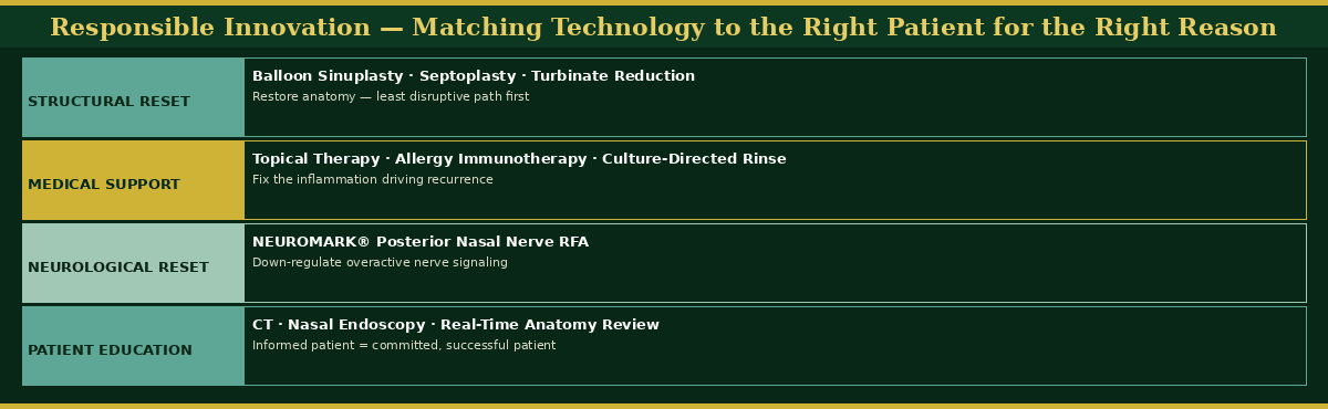 Good ENT care is not about doing more — it is about doing what is right for the patient. The best clinical outcomes in thirty years of rhinologic practice have not come from the most aggressive interventions. They have come from the most precise ones: the right treatment, matched to the right driver, delivered at the right time.